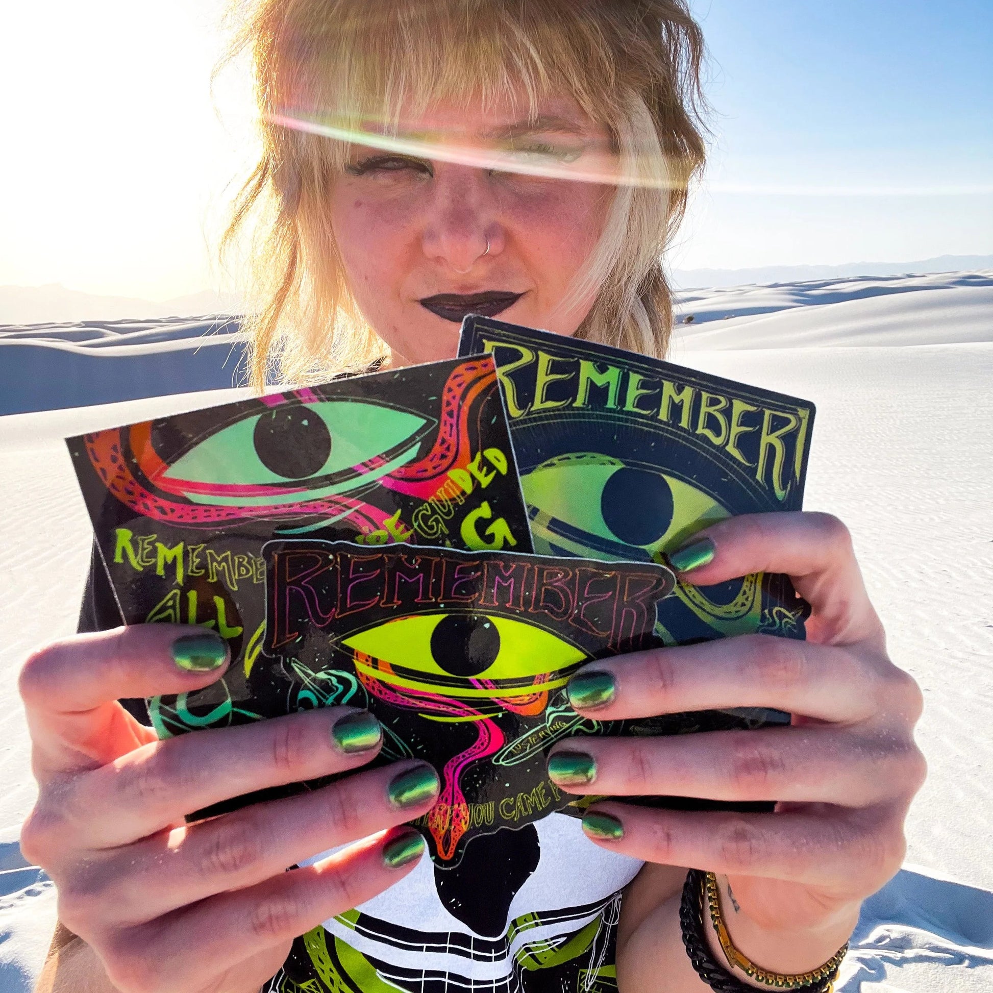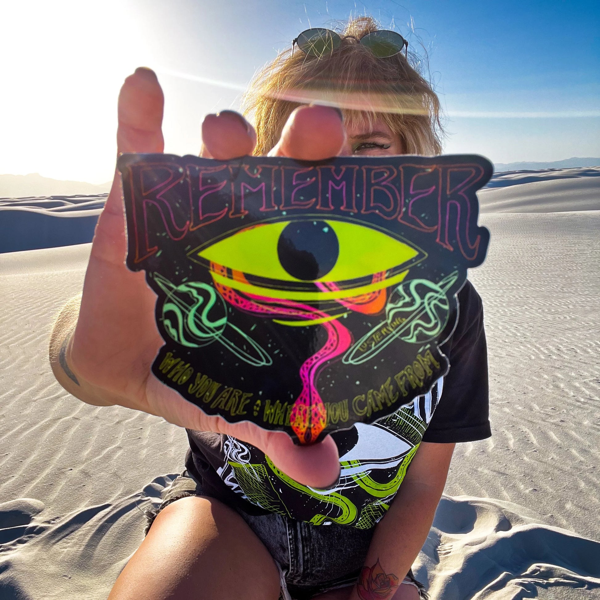These are decal-quality, holographic stickers, and feature hand-drawn elements of the “Remember” design. Waterproof, weatherproof, and dishwasher safe.