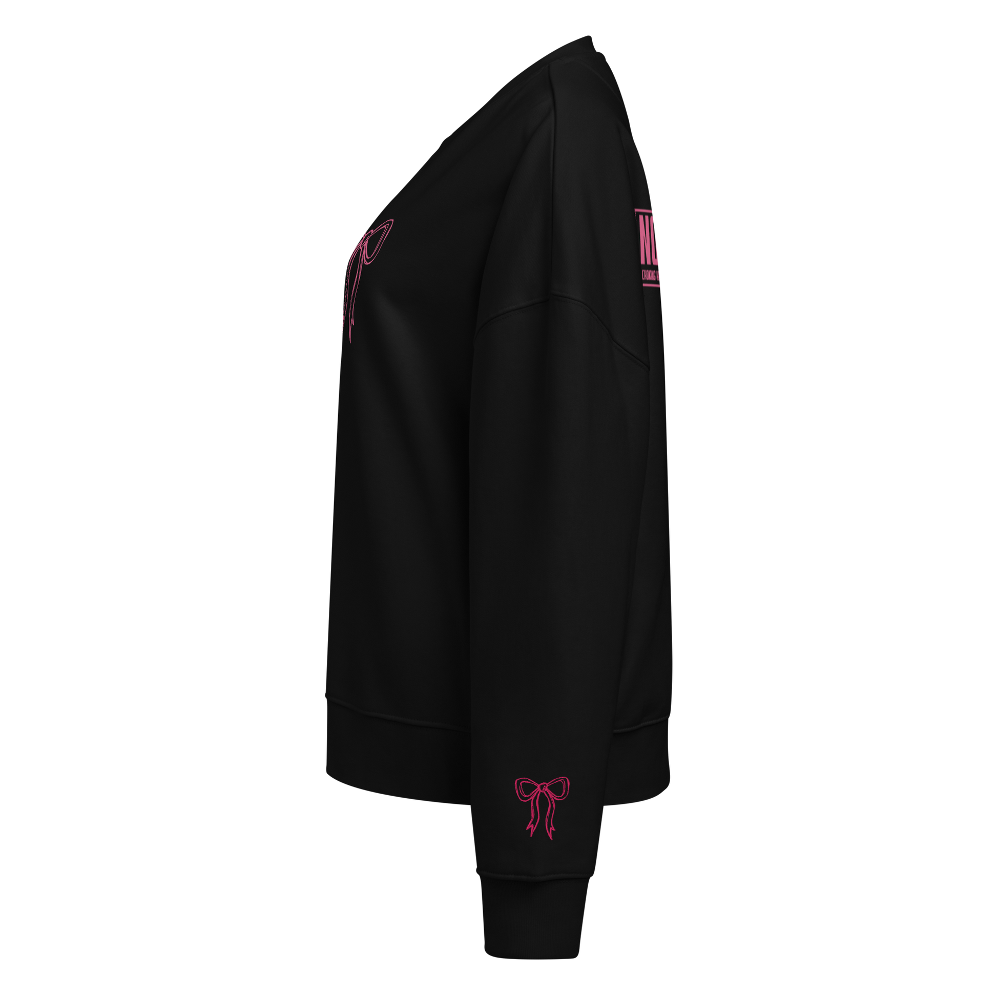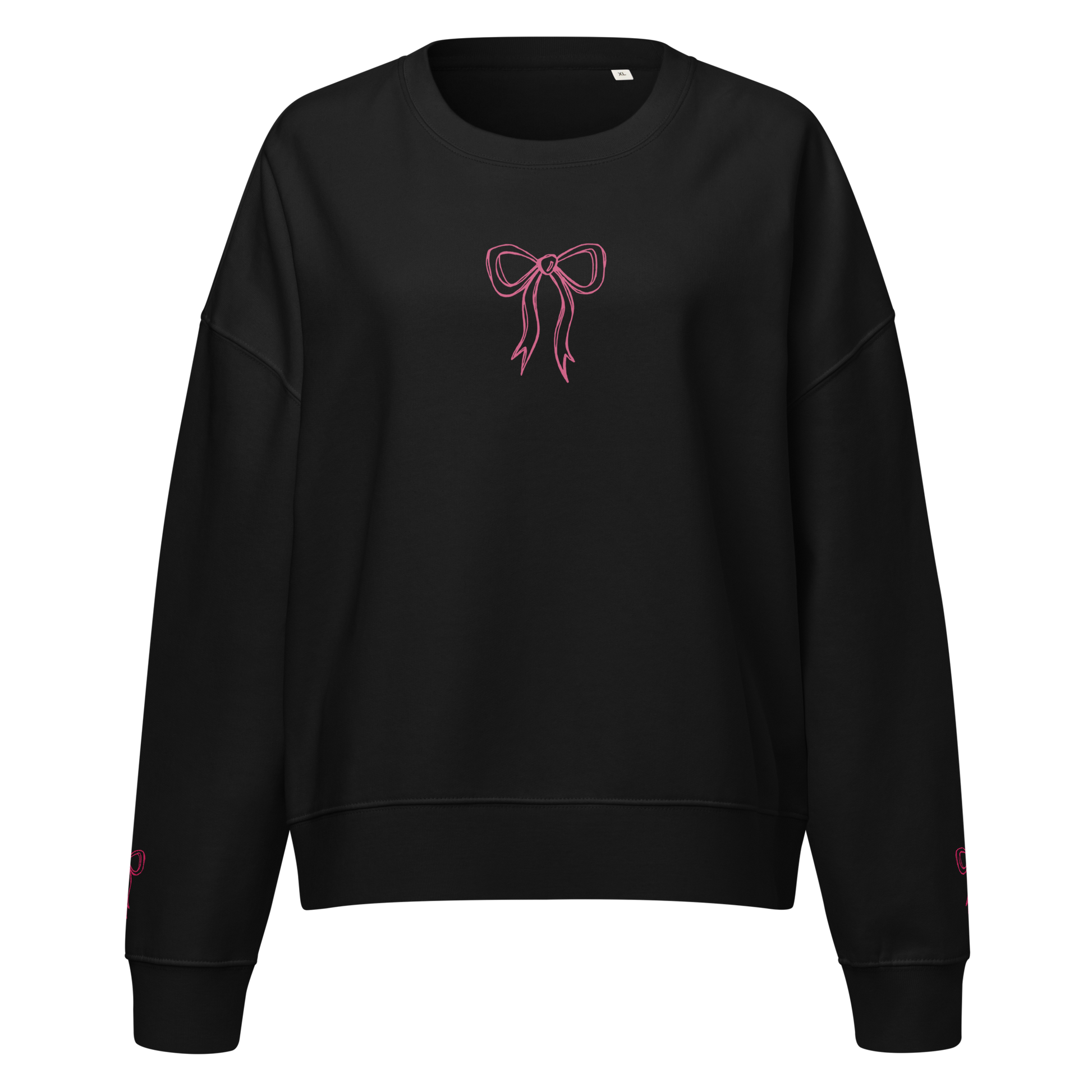 This in-house designed sweatshirt is part of the TOY collection. Hot pink bows printed on the chest and embroidered on the sleeves add a subtle pop of color, while the back features a warning label graphic: "NOT A TOY. CHOKING HAZARD. KEEP OUT OF REACH OF CHILDREN." It's a statement piece—unapologetic and direct. Organic cotton construction keeps it breathable and all-day wearable.